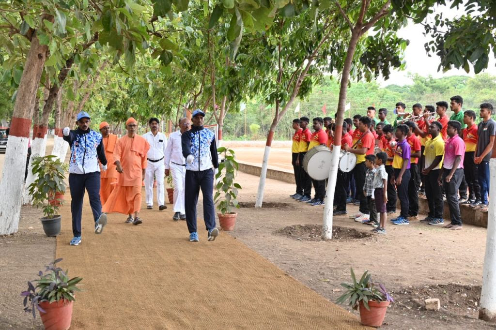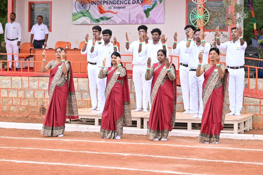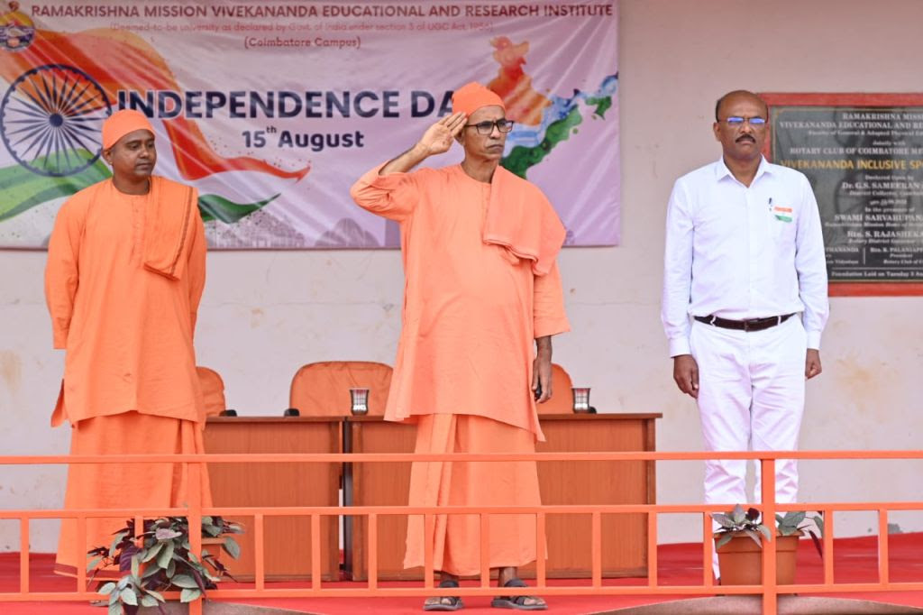The 79th Independence Day 2025 was celebrated at RKMVERI, Coimbatore Campus with patriotic spirit and enthusiastic participation. The National Flag was hoisted by Swami Garishthananda, Administrative Head, RKMVERI, Coimbatore Campus, accompanied by Swami Karunikananda, Assistant Administrative Head, and Dr. R. Giridharan, Associate Professor & Head, RKMVERI–GAPEY, Coimbatore Campus.